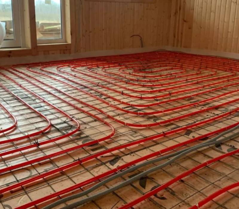 - В слой стяжки укладывают кабели или трубы при монтаже теплого пола.
